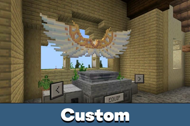 This Elytra Mod for Minecraft Bedrock introduces ten unique wing designs with custom animations and an interactive selection system. Players spawn on a themed island where they can immediately test different flight styles.